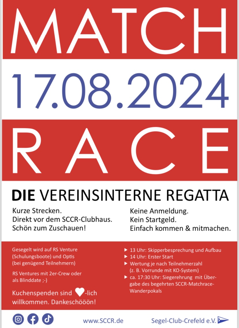 Bei unserer traditionellen vereinsinternen Regatta „Matchrace“ segeln am Samstag 17. August 2024 jeweils zwei Boote gegeneinander. Wer gewinnt, kommt weiter, das unterlegene Boot ist raus.