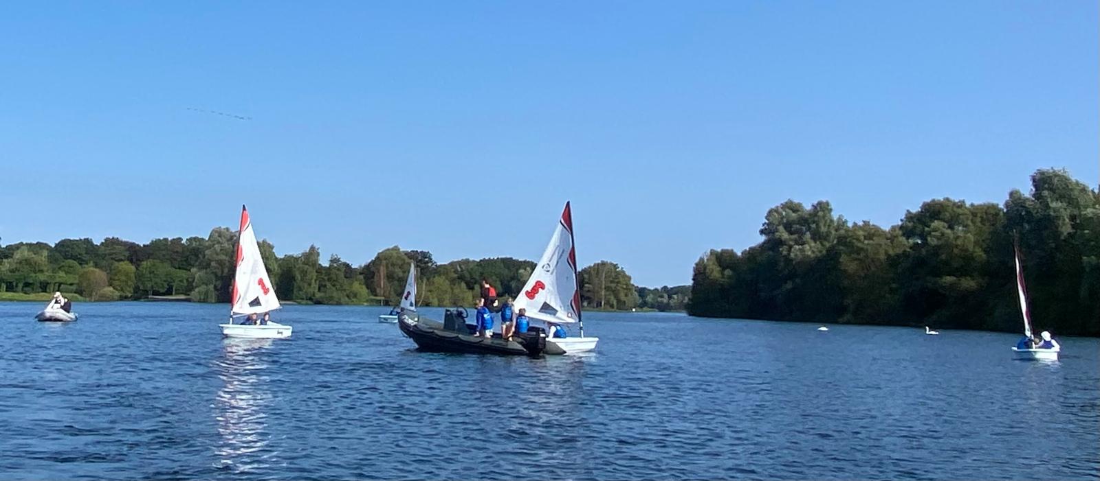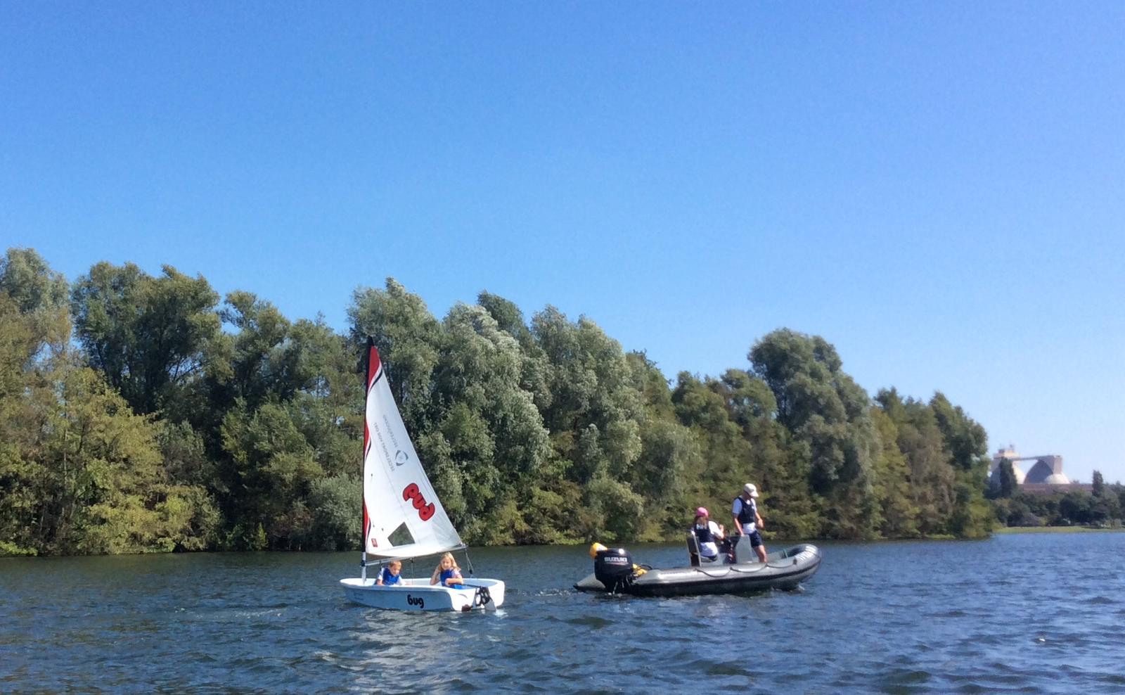 Am Montagmorgen ging es bei strahlendem Sonnenschein los. Wer das bronzene Schwimmabzeichen besaß konnte das Segeln direkt auf dem Wasser ausprobieren. Das Team war mit einem großen Hänger angereist, in dem sich neben den enorm praktischen Booten „Bugs“ (Optimisten mit fest integrierten Rädern wie bei einer Schubkarre) auch ein Tour Labor zum Experimentieren befand. In diesem Labor forschten parallel Kinder an Land rund um das Thema Wasser. Die Kinder übten Knoten an Brettern und die wichtigsten Begriffe am Optimisten. Sie klebten die erlernten Fachbegriffe mit Krepppapier auf die entsprechenden Bootsteile.
