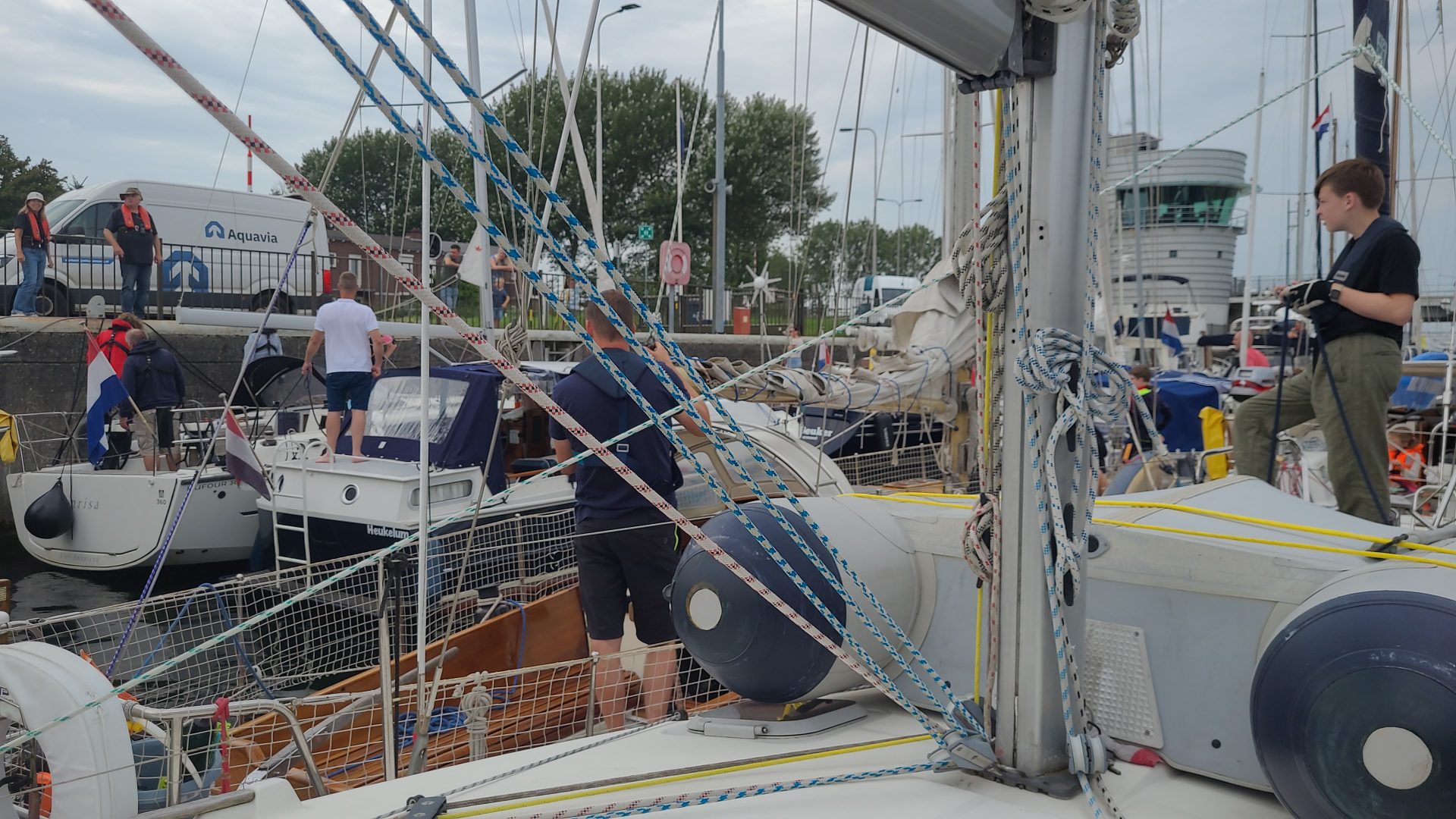 In der Hoffnung, Sint Annaland erst Freitag wieder zu sehen, machten wir uns Mittwoch auf ins Grevelinger Meer Richtung Scharendijke. Das Schleusen in der Grevelingen Sluis war an diesem Tag besonders interessant. Die Schleusenkammer war komplett gefüllt. Zahlreiche Motor und Segelyachten verschiedener Größen wurden vom Schleusenwärter eingewiesen. Für uns war es eine wichtige Erfahrung, in diesem Segelrevier die relevanten Manöver rund um das sichere Schleusen in der Praxis zu üben. Da wir bereits mit den ersten Booten in die Schleusenkammer eingefahren waren, konnten wir in aller Ruhe das Schleusenkino als eröffnet erklären, und das Schauspiel der anderen Segel sowie das charismatische Wesen des Schleusenwärters genießen.