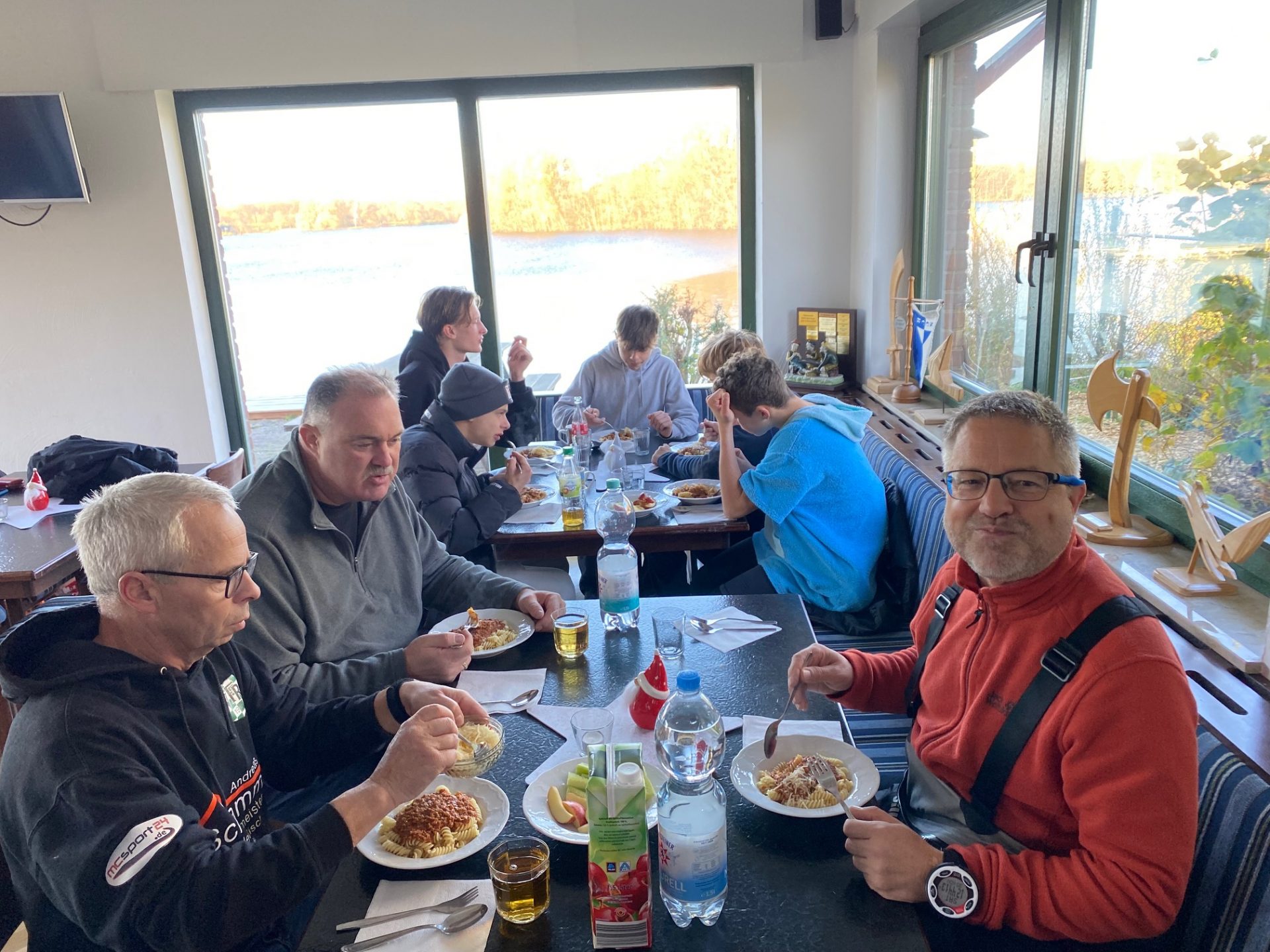 Gestartet wird jeweils um 10 Uhr und nach einer Vormittagseinheit treffen sich alle mittags zu einer gemeinsamen warmen Mahlzeit im Vereinsheim, das die Teilnehmer (bzw. deren Familien) reihum selbst organisieren. Heute gibt Christian den Seglern nach Pasta mit leckerer Bolognese sowie warmen Waffeln anhand von Videos individuelle Verbesserungvorschläge. Normalerweise endet das Training gegen ca. 16 Uhr. Lassen winterliche Wetterbedingungen mal keine Wasserzeit zu, entfällt das Training oder wird auf einen Ersatztermin verschoben. In diesem Winter sind auch Jugendliche von zwei anderen Segelvereinen dabei. Bei Fragen oder Interesse an dem Training wendet Euch bitte an Claas Heise.