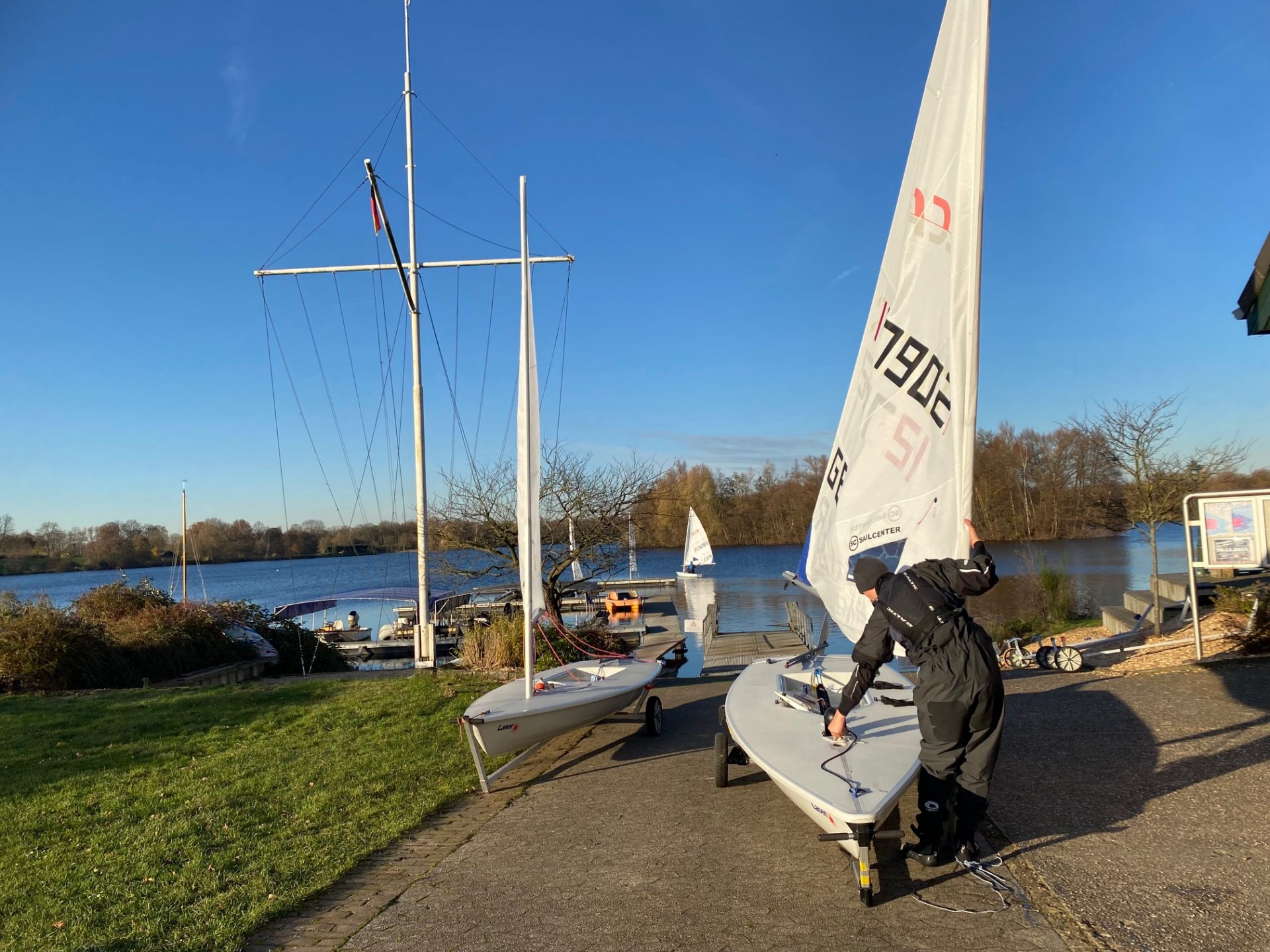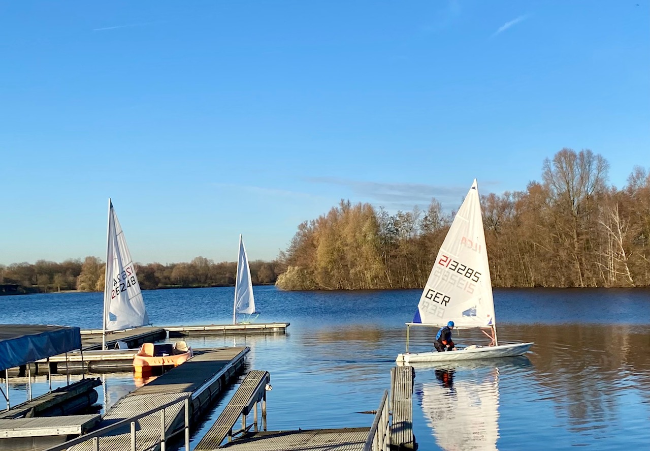 30. November 2024. Heute sind fünf der angemeldeten sechs Jugendlichen sowie zwei erwachsene Regattasegler zum Wintertraining gekommen. Das Thermometer zeigt niedrige einstellige Temperaturen, aber ein kräftiger Wind und strahlende Sonne locken die unerschrockenen Segler auf den Elfrather See. Insgesamt sind diesen Winter sieben Trainingseinheiten an verschiedenen Samstagen geplant, in denen Trainer Christian Uhlig sein fundiertes Wissen und jahrelange Erfahrung weitergibt. Er beobachtet und analysiert die Segler jeweils vom begleitenden Motorboot aus. Die meisten der teilnehmenden Segler haben bereits Regattaerfahrung gesammelt, aber wollen ihre Fähigkeiten weiter ausbauen. Wie kann ich noch besser trimmen, Winddreher oder den wichtigen Start erfolgreicher für mich nutzen?