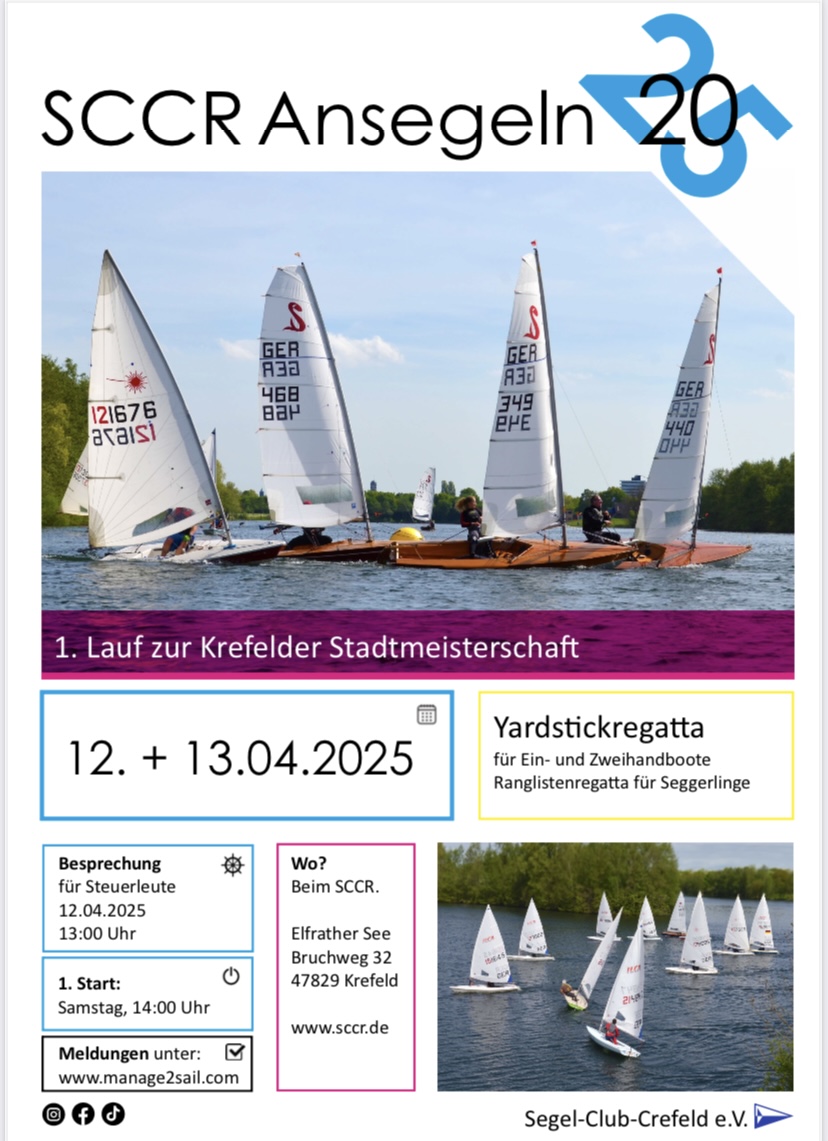 Das SCCR-Ansegeln ist eine Yardstickregatta für Ein- und Zweihandboote. Diese Regatta ist gleichzeitig in jedem Jahr die erste von vier Regatten für die Krefelder Stadtmeisterschaft im Segeln und die „Seggerlinge segeln um Punkte in Ihrer Rangliste.