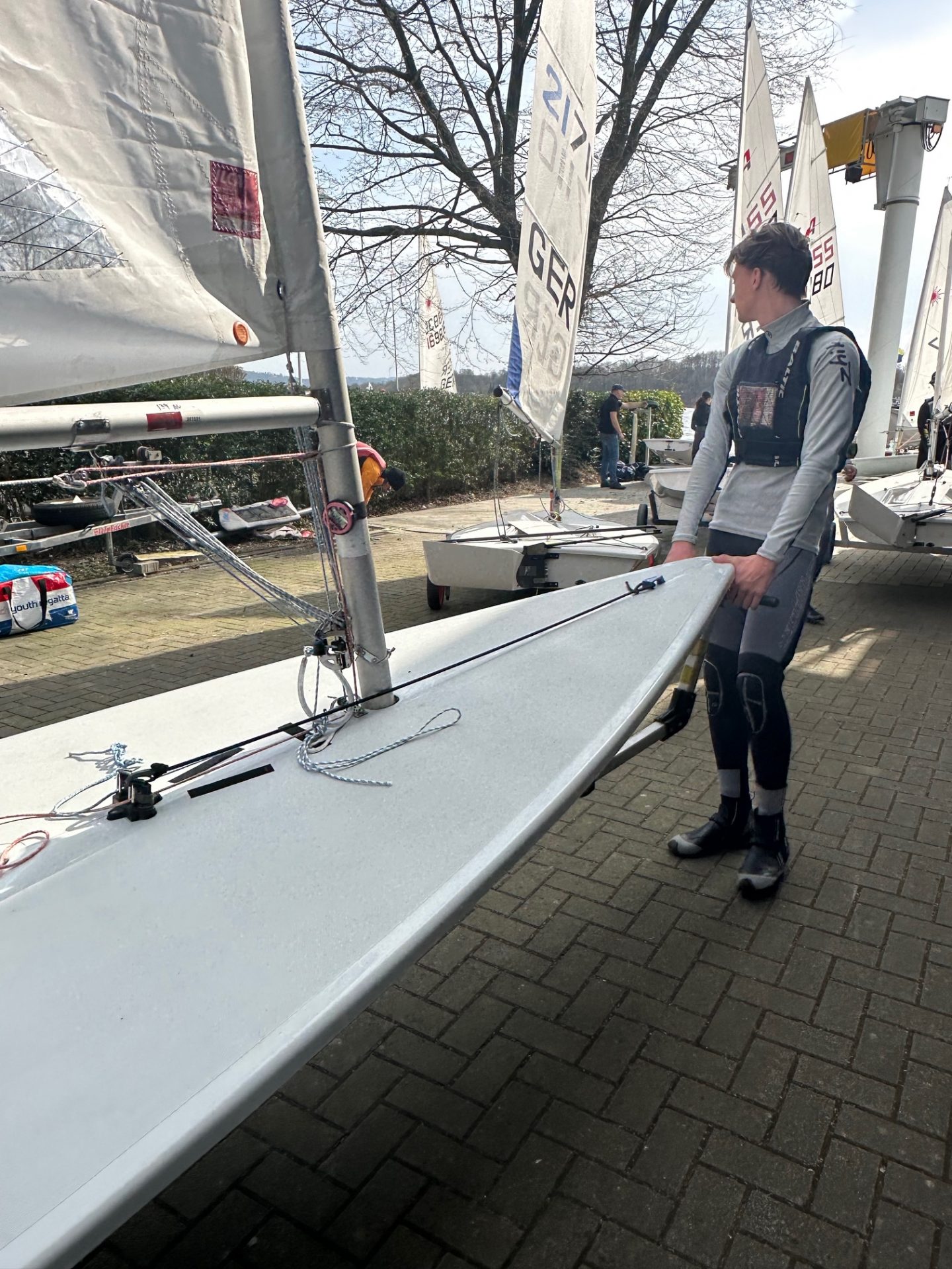 Das Warmup gab es zu Beginn gratis dazu. Die Boote mussten per Hand etwa 200m vom Parkplatz , unter einer Brücke hindurch zum Verein gezogen werden. Auf dem Gelänge selbst lagen die Boote dann dicht an dicht. Wieder einmal durften wir feststellen, wie komfortable das SCCR-Gelände mit seiner Slipp-Anlage eigentlich ist. Beim WSB ging es für die Laser vorwärts ins Wasser, dann noch ein wenig an Pollern entlang hangeln und raus auf den schönen Baldeneysee.