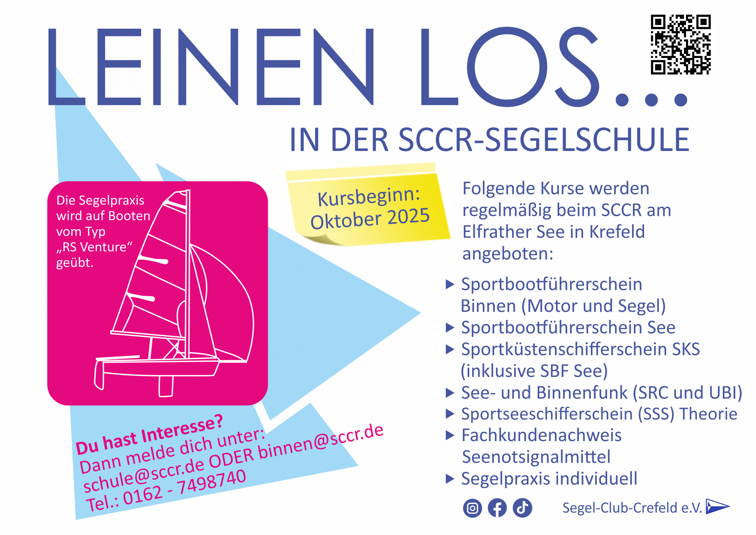 Im Oktober beginnt im SCCR die neue Saison in der Segelschule. Die Teilnehmerlisten füllen sich langsam, aber noch sind Plätze frei. Informationen und Anmeldung unter schule@sccr.de oder 0162/7498740.