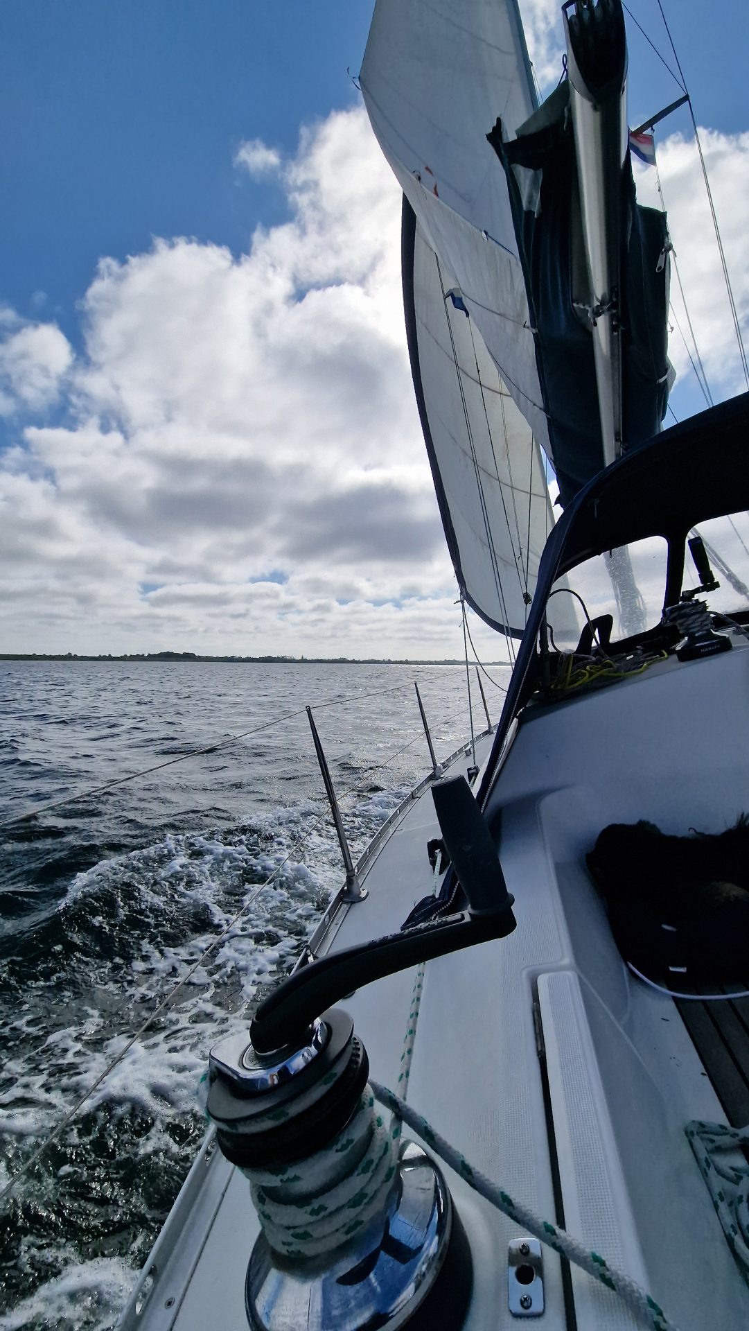 Am Samstag ging es dann bei reichlich Wind raus aufs Grevelinger Meer. Erstmal mit der Schräglage klarkommen und dann langsam ein Gefühl für die Blondi bekommen. Noch schnell mit dem Boot ein Impeller-Ersatzteil in Port Zeelande abgeholt, was gleich eine gute Möglichkeit war das Anlegen zu üben. Dann durfte jeder mal ans Ruder und so drehten wir eine große, schöne Runde mit 7.4 Knoten Spitzengeschwindigkeit!