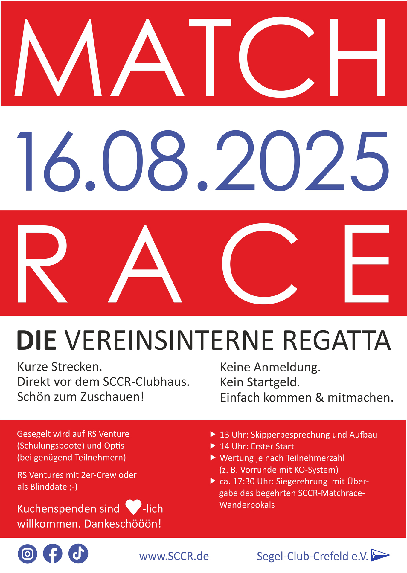 13 Uhr Steuermannsbesprechung und Aufbau. 14 Uhr Start. 17 Uhr Siegerehrung mit dem begehrten Matchrace-Wanderpokal!