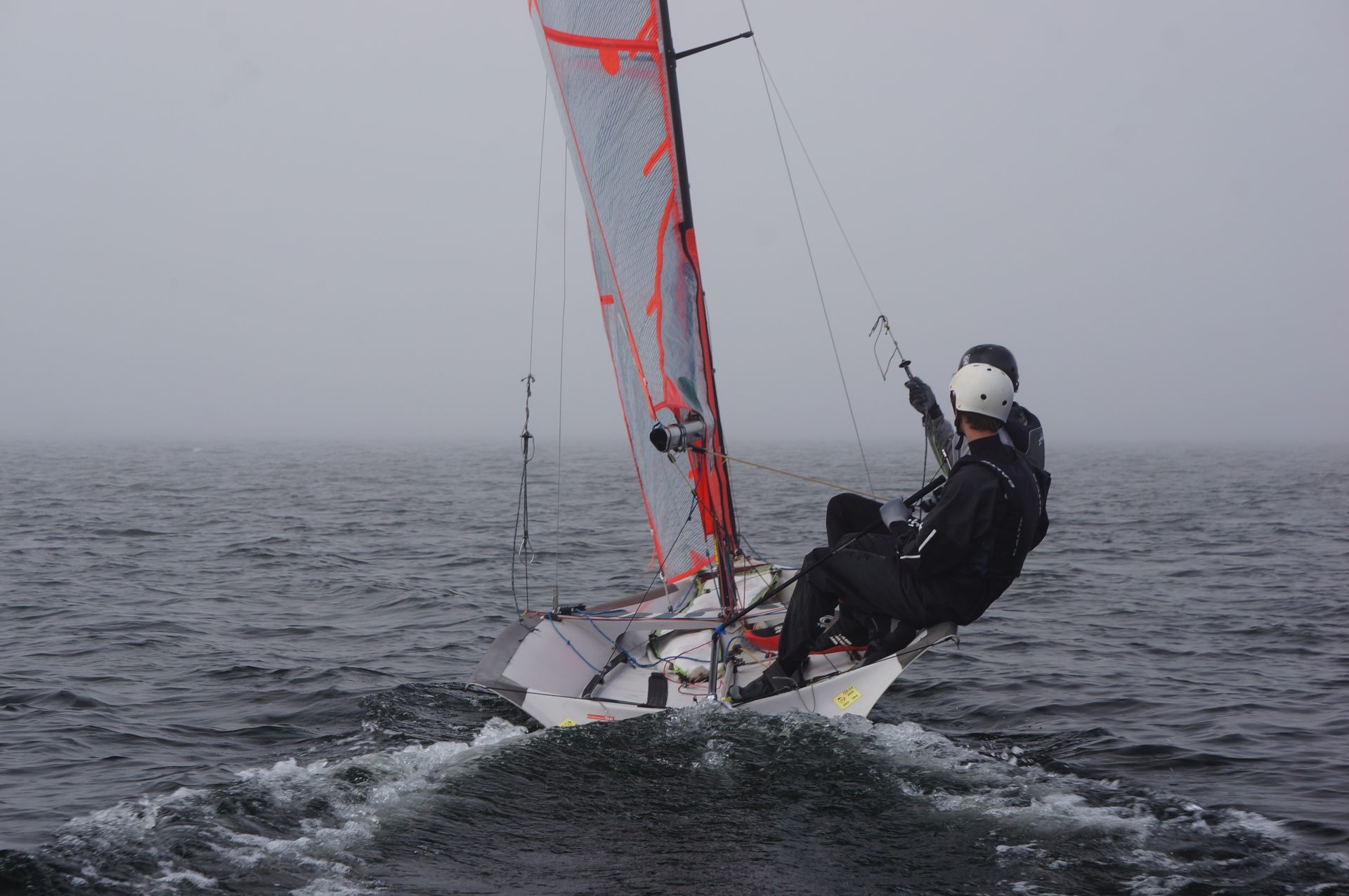 8,3 qm Segelfläche am Wind plus 7qm Gennaker wollen beherrscht werden und beschleunigen das 70 kg leichte Boot auch bei leichten Winden.